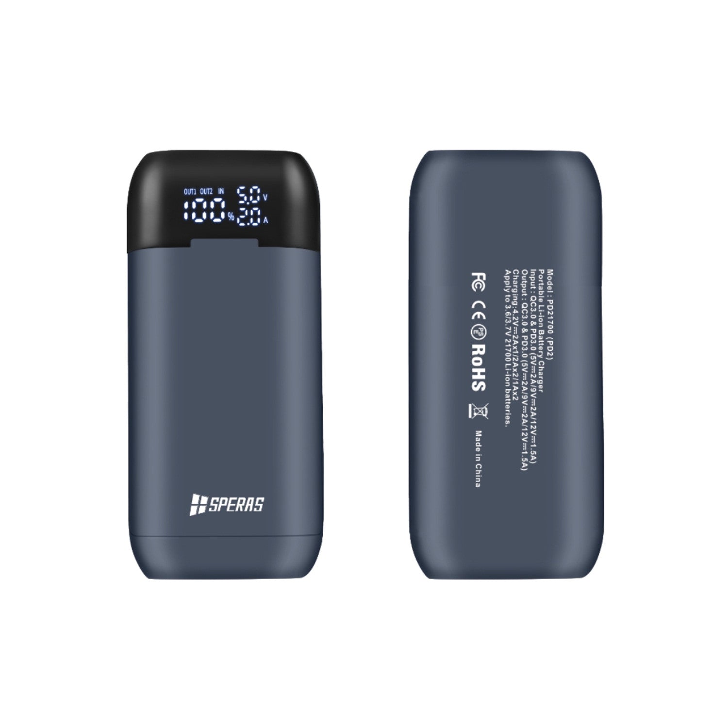 This Speras device has a dual function as a battery charger and a power bank for your other devices! It is compatible with 21700 and 18650 lithium batteries, it has two independantly controlled charging slots, and a safety cutoff at 4.2V when battery is fully charged. This Speras Dual Charger has an LED indicator to show the charging status and automatic voltage detection, with reverse polarity protection.