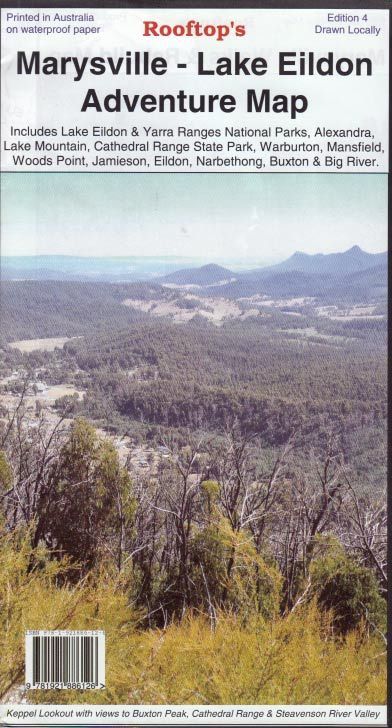 The reverse of the map has enlargements of the Cathedral Range, Marysville Walks, Buxton Mountain bike trails, Marysville rebuild (a fascinating map), and a pictorial guide to what's under Lake Eildon.